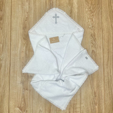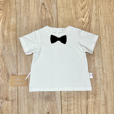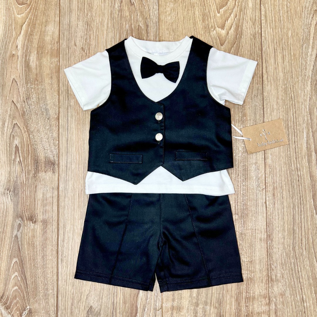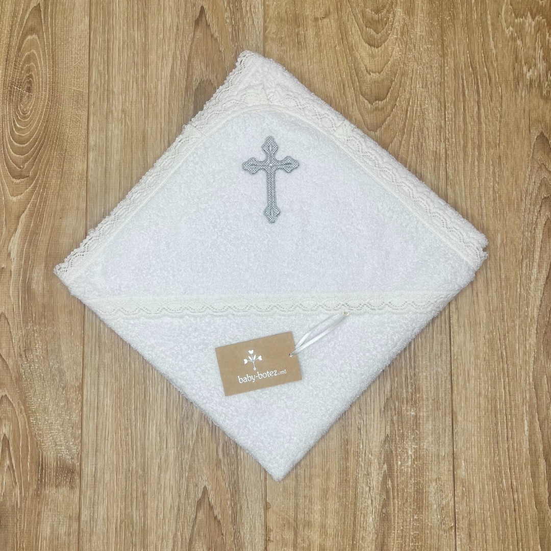 Compoziție Costum, tricou cu papion, prosop cu glugă, plăpumioară, săculeț, lumânare cu buchet