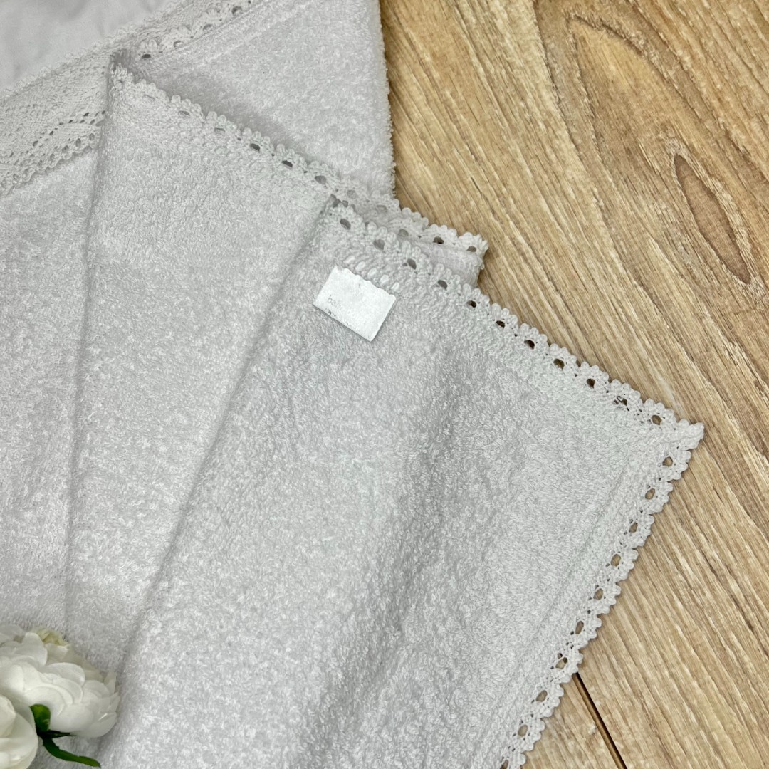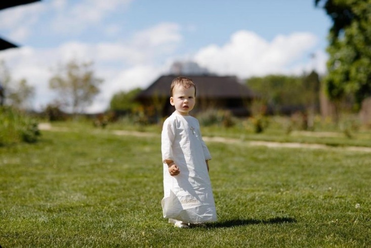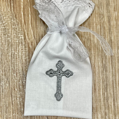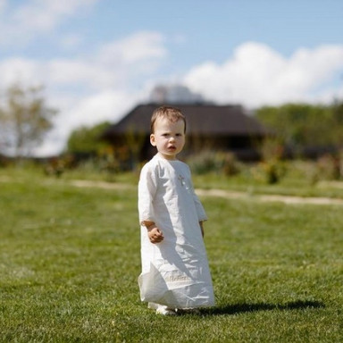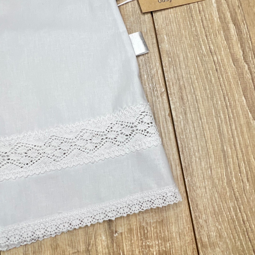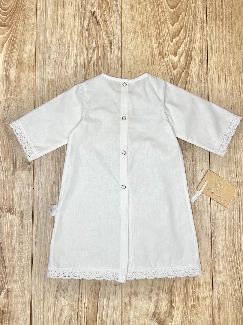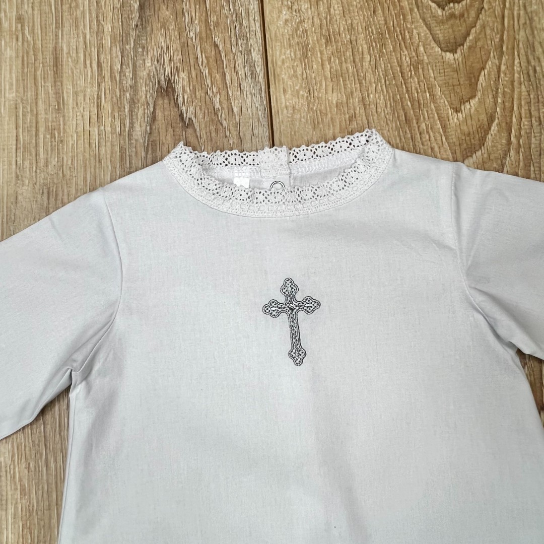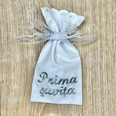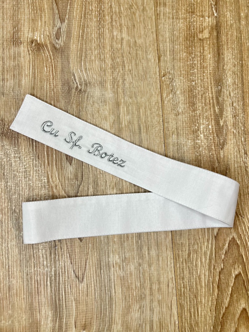 Compoziție Cămașă de botez, prosop cu glugă, scutec, panglică, săculeț pentru cruciuliță, săculeț pentru șuviță