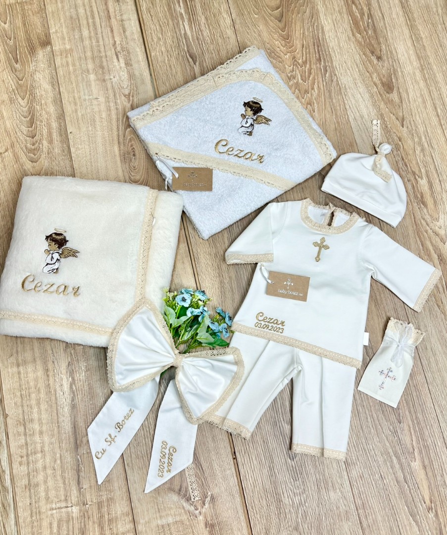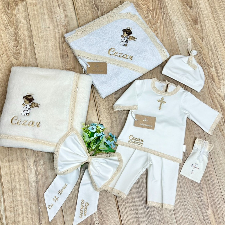 Compoziție Costum, căciuliță, prosop cu glugă, plăpumioară, săculeț, fundă pentru crâșmă