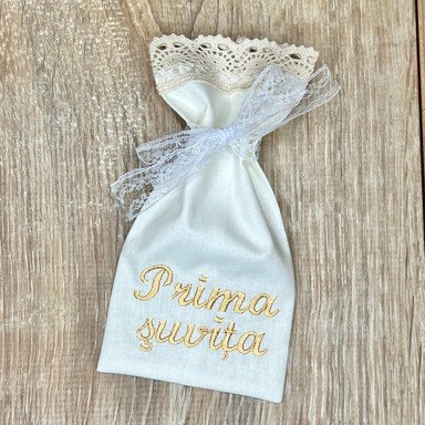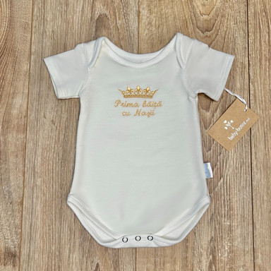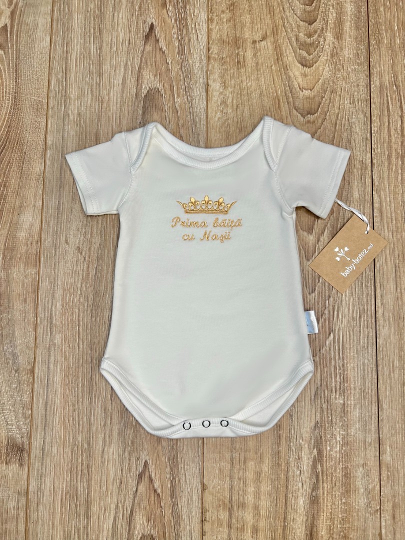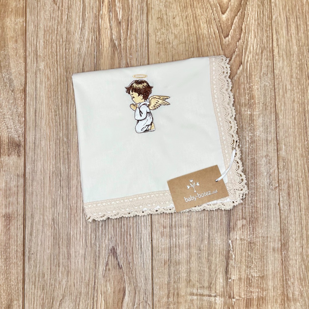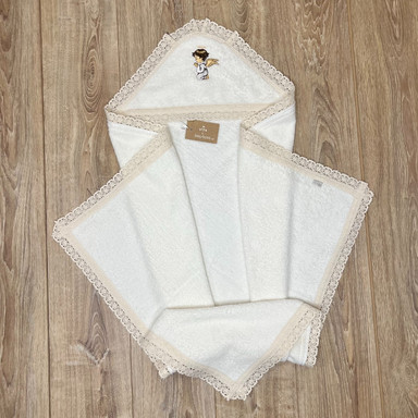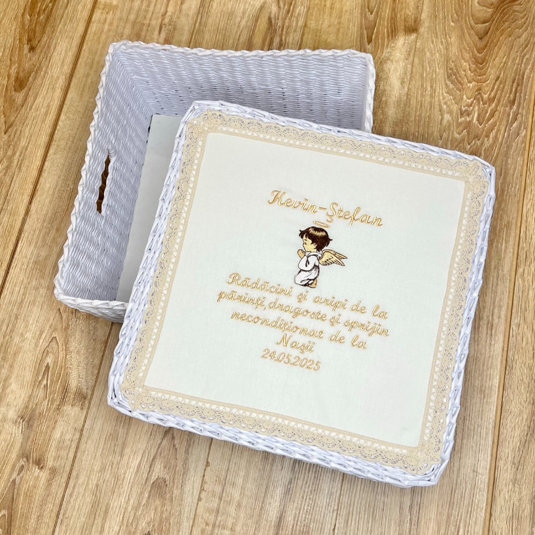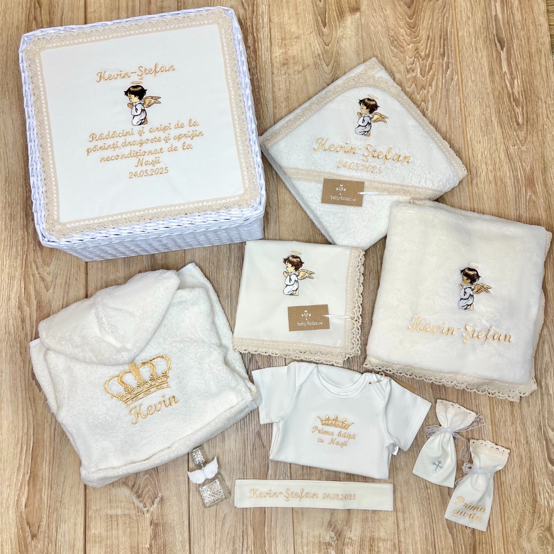 | Compoziție | Cutie împletită, prosop cu glugă, plăpumioară, scutec, body, halat, panglică, săculeț pentru șuviță, săculeț pentru cruciuliță, borcănel |