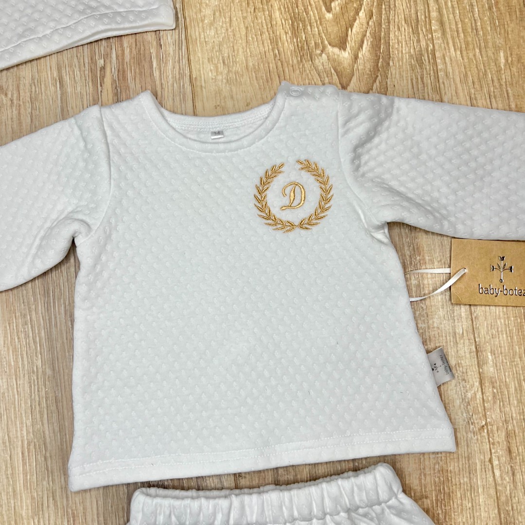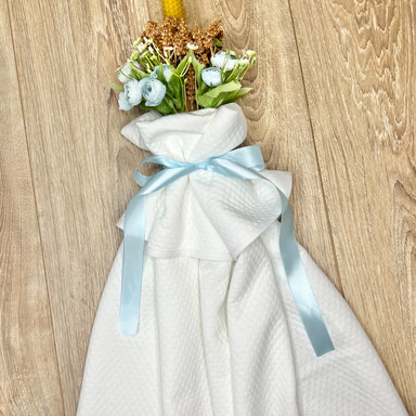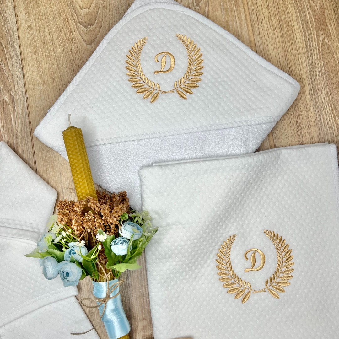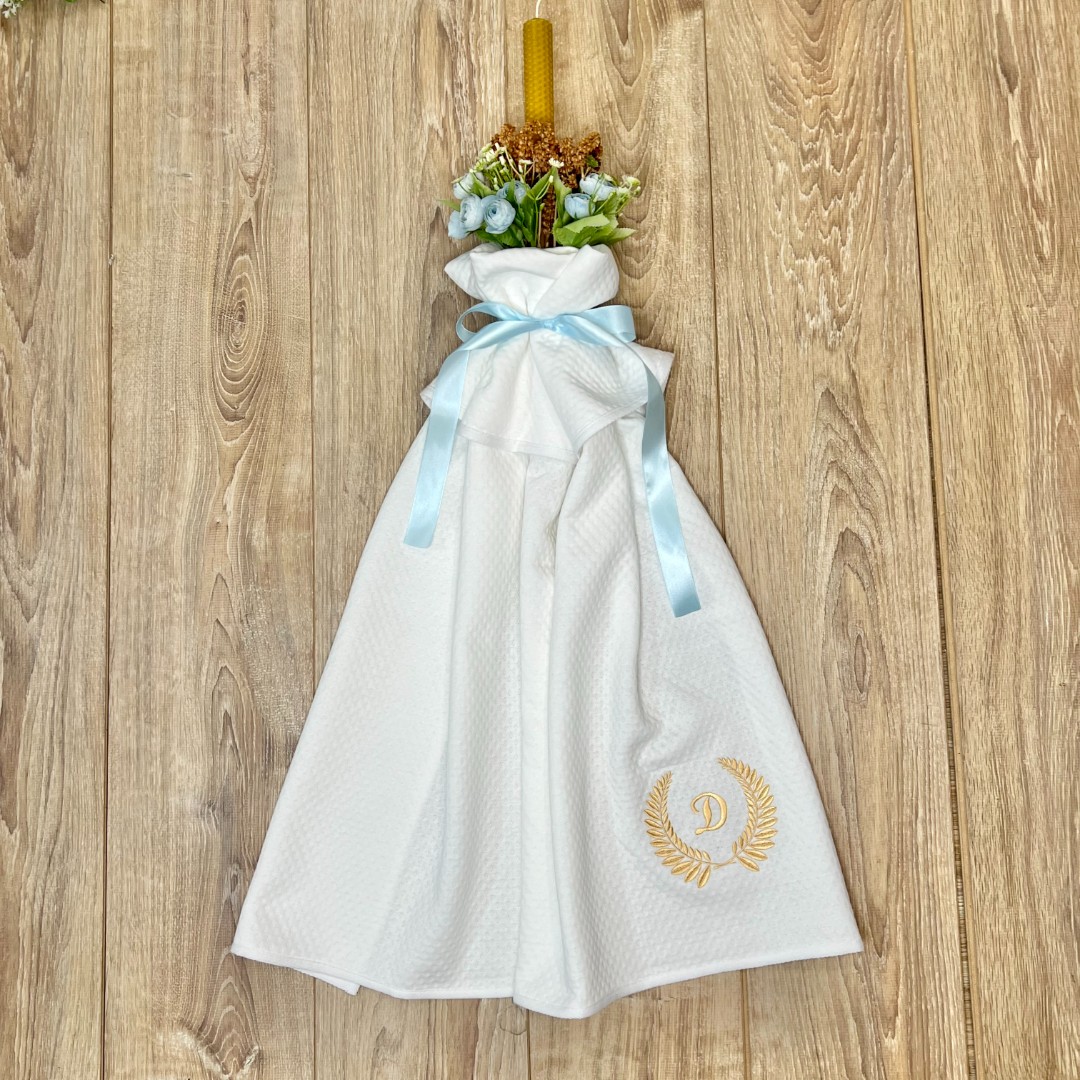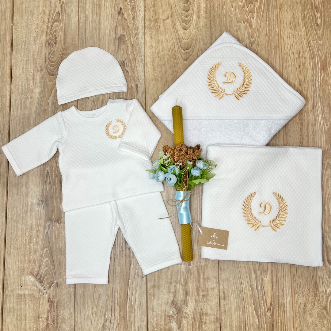 Compoziție Costum, căciuliță, prosop cu glugă, păturică, lumânare cu buchet și busuioc