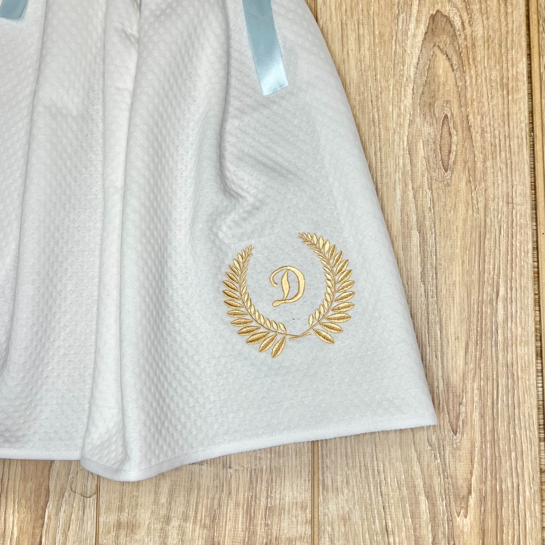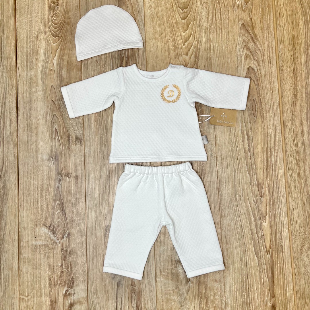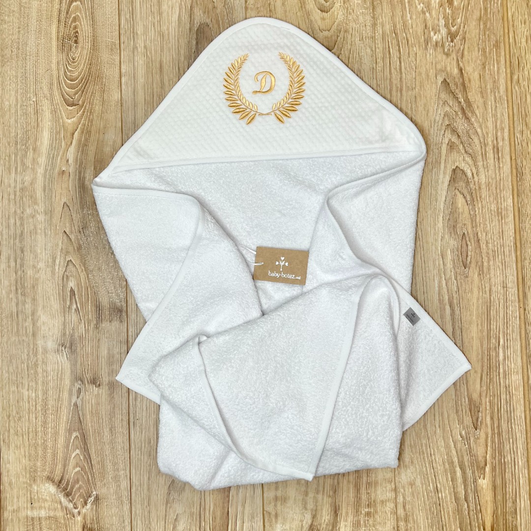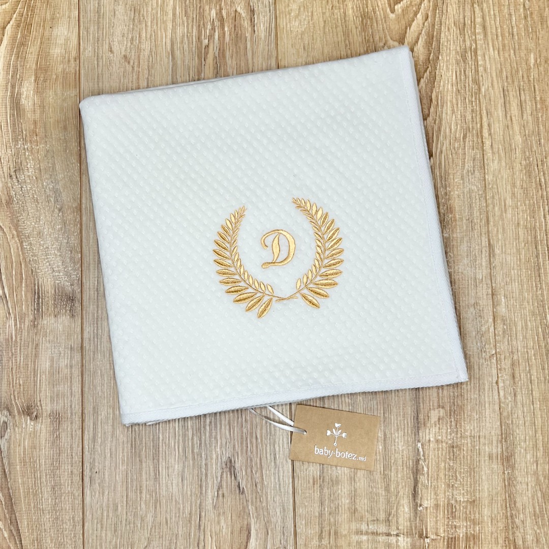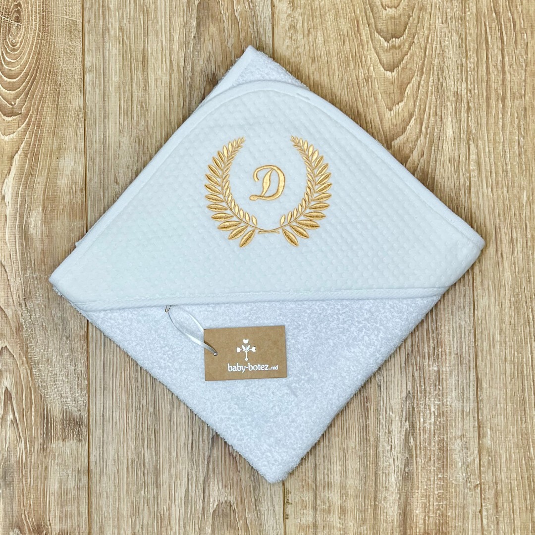 Compoziție Costum, căciuliță, prosop cu glugă, păturică, lumânare cu buchet și busuioc