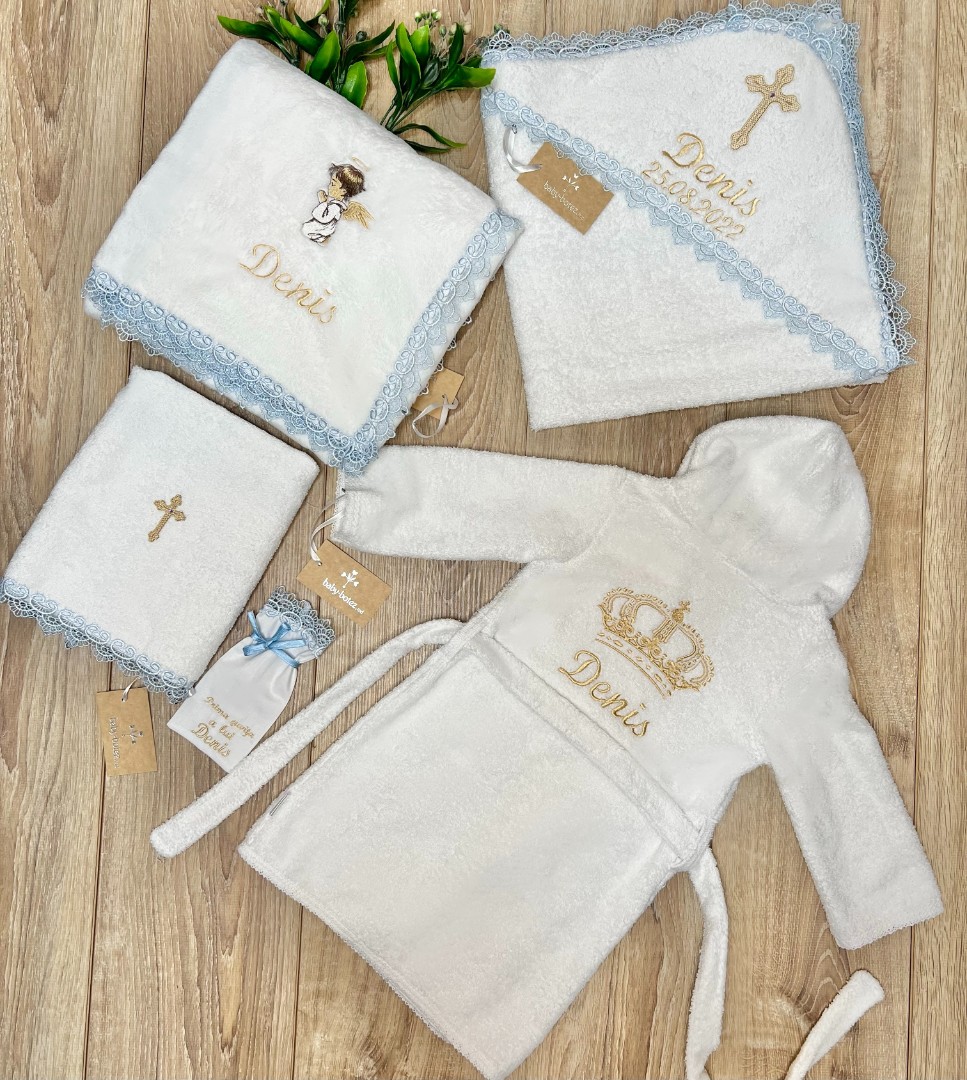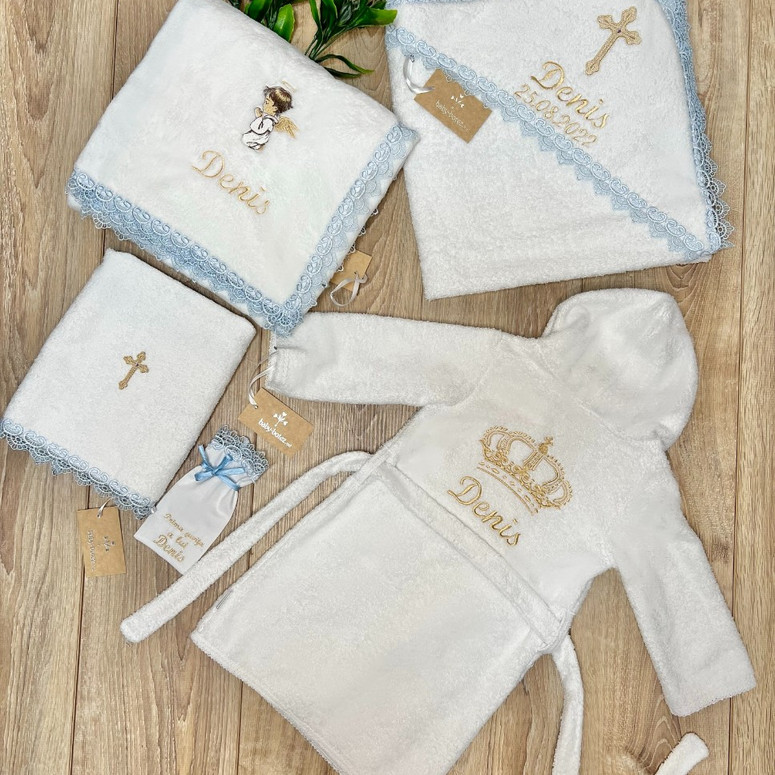 Compoziție Prosop cu glugă, prosop pentru biserică, plăpumioară, săculeț pentru șuviță, halat