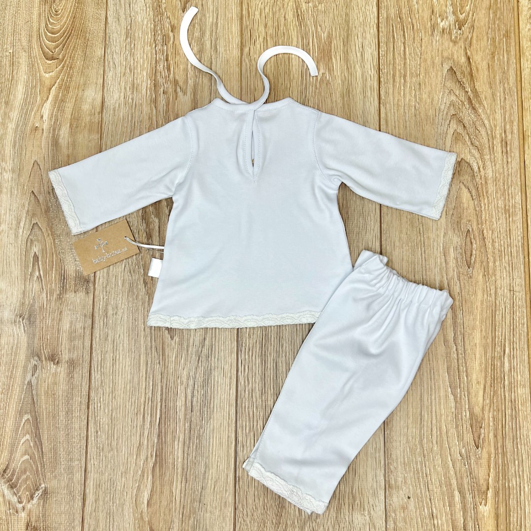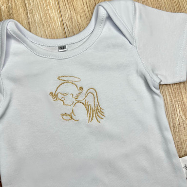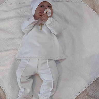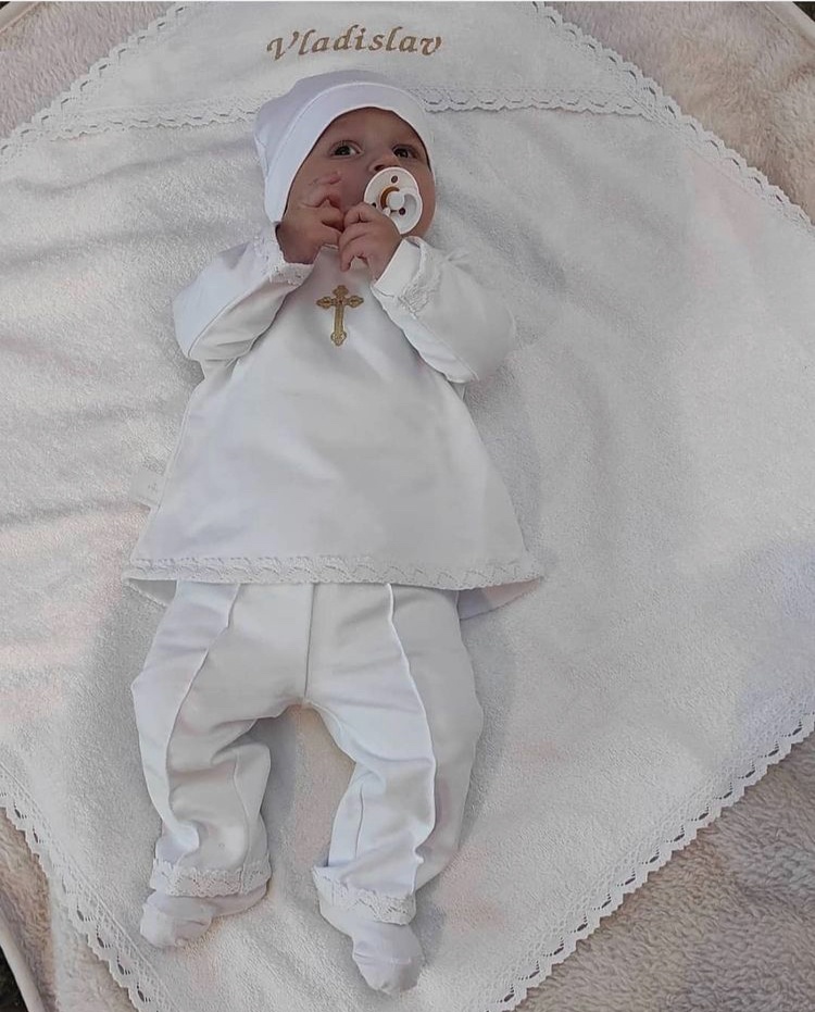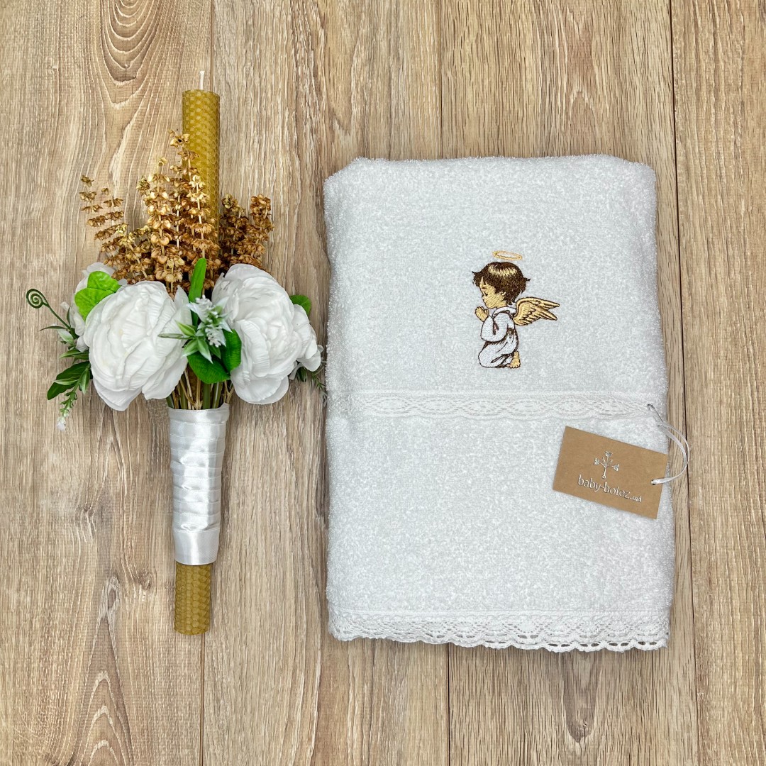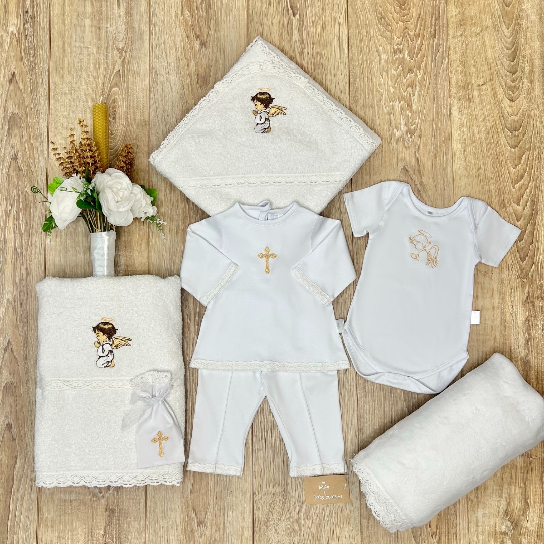 Compoziție Costum, prosop cu glugă, body, căciuliță, plăpumioară, prosop pentru crâșmă, lumânare cu buchet și busuioc