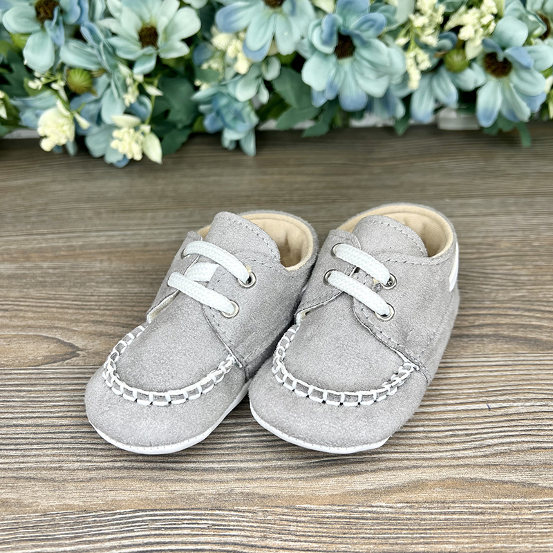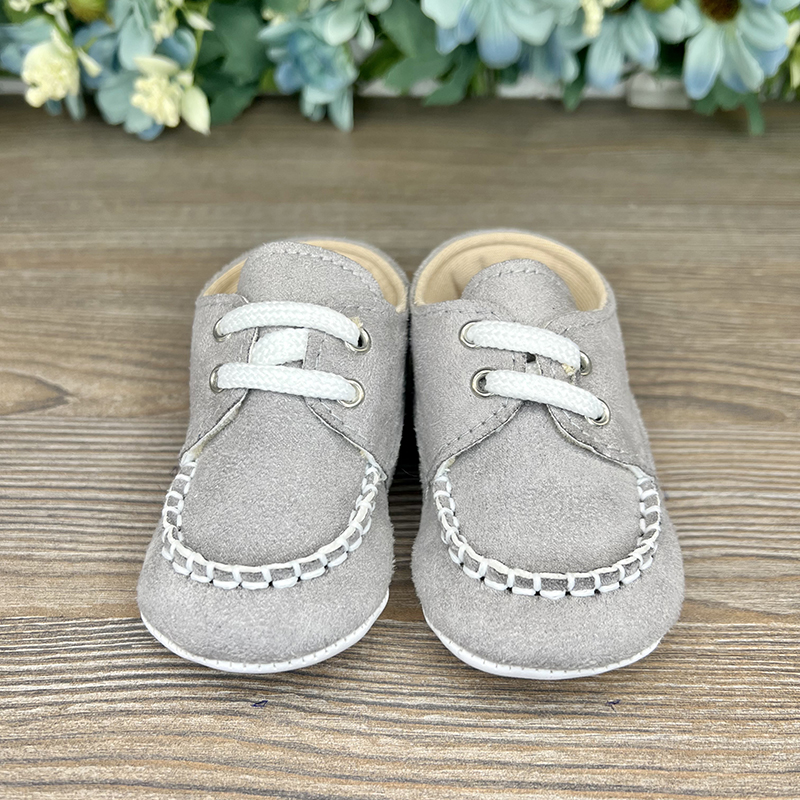 Pantofi tip ghetuțe cu șireturi din piele întoarsă ecologică, care nu restricționează mișcarea picioarelor și degetelor. Ușor de încălțat și descălțat, oferind confort maxim pentru micuțul tău