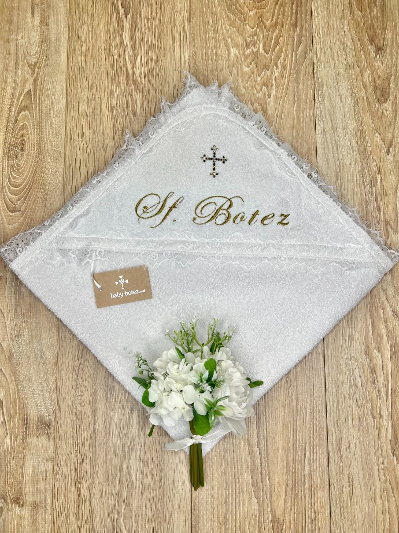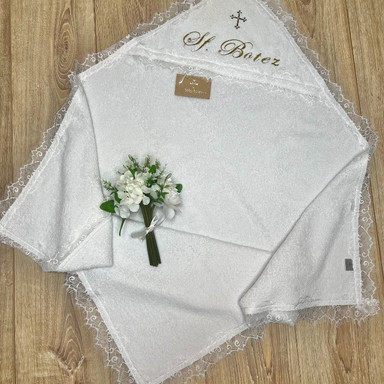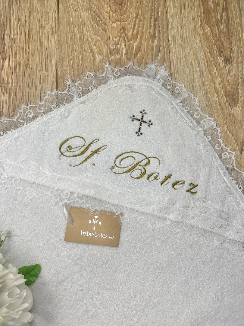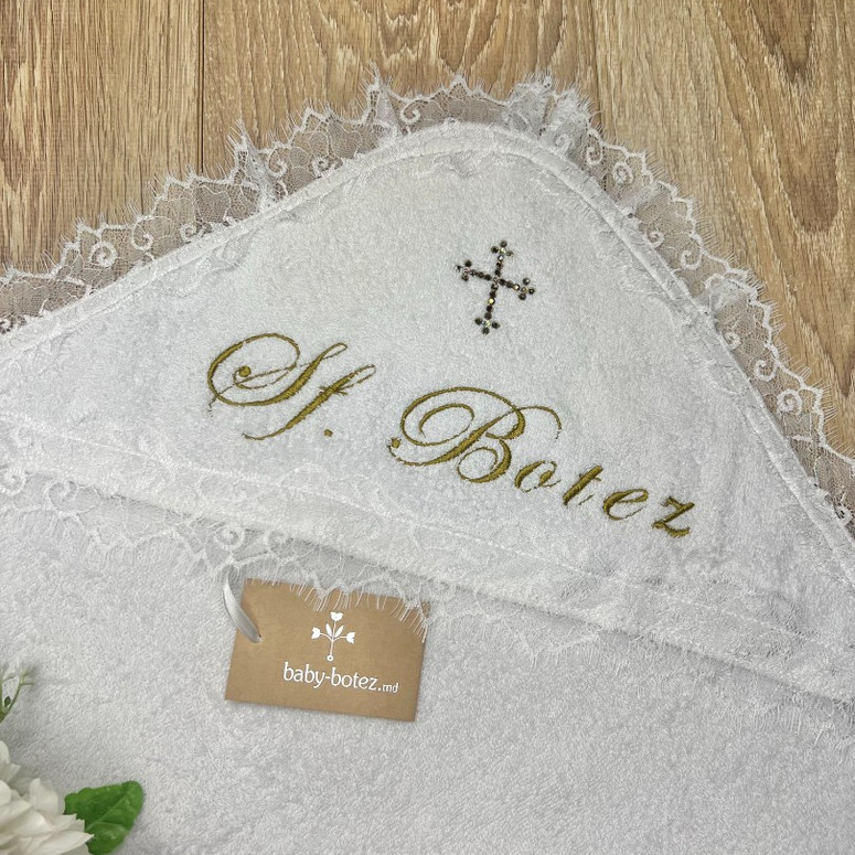 Prosop cu glugă, decorat cu dantelă franțuzească, cruce din strasuri și broderie